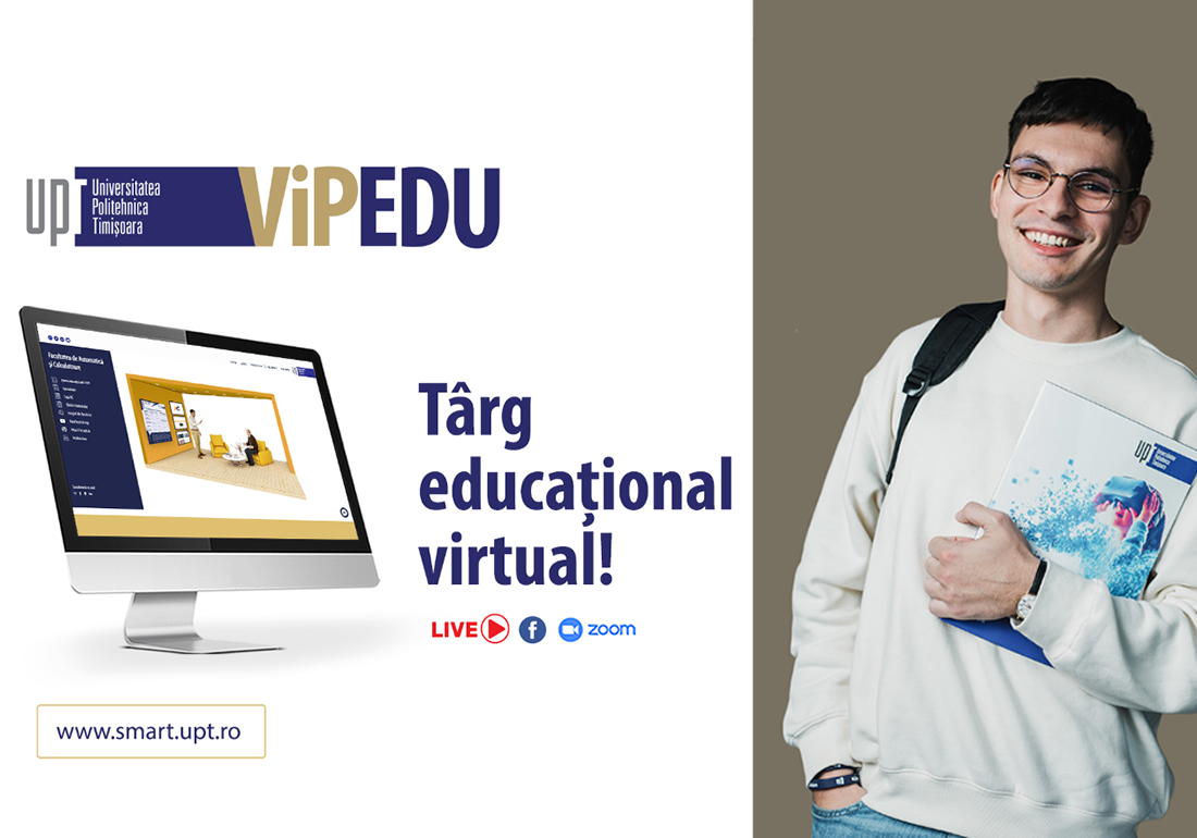 Călătorește Virtual în lumea Politehnicii: 10 facultăți, 24 de domenii de licență și 57 de specializări așteaptă să fie descoperite la ViP EDU. Târgul se adresează tuturor persoanelor (elevi, părinți, cadre didactice, etc.) dornice să afle informații cu privire la oferta educațională a UPT, dar și numeroasele oportunități de care se bucură un viitor student UPT.